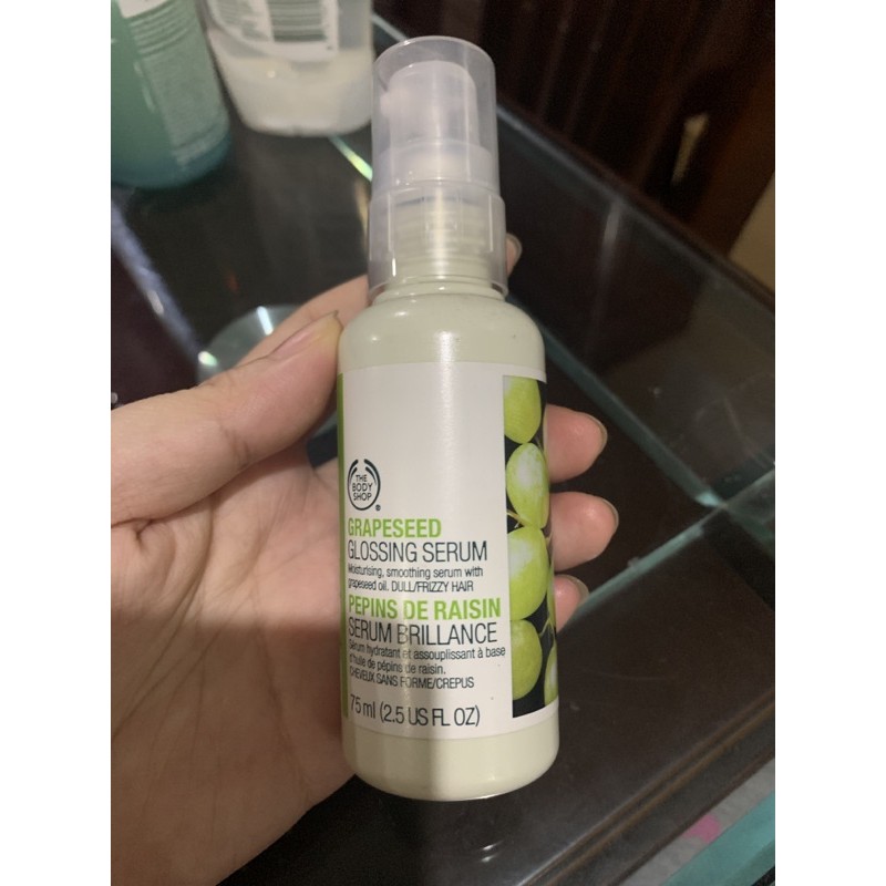Apply a small amount through your hair, . The bodyshop grapeseed glossing serum · hair serum · adds gloss · easily washed out · for dull, frizz prone hair · contains grapeseed extract · community trade sesame . The body shop grapeseed glossing serum swatch pros: Smooth your hair and increase the shine with this glossy serum. · little goes long way;
